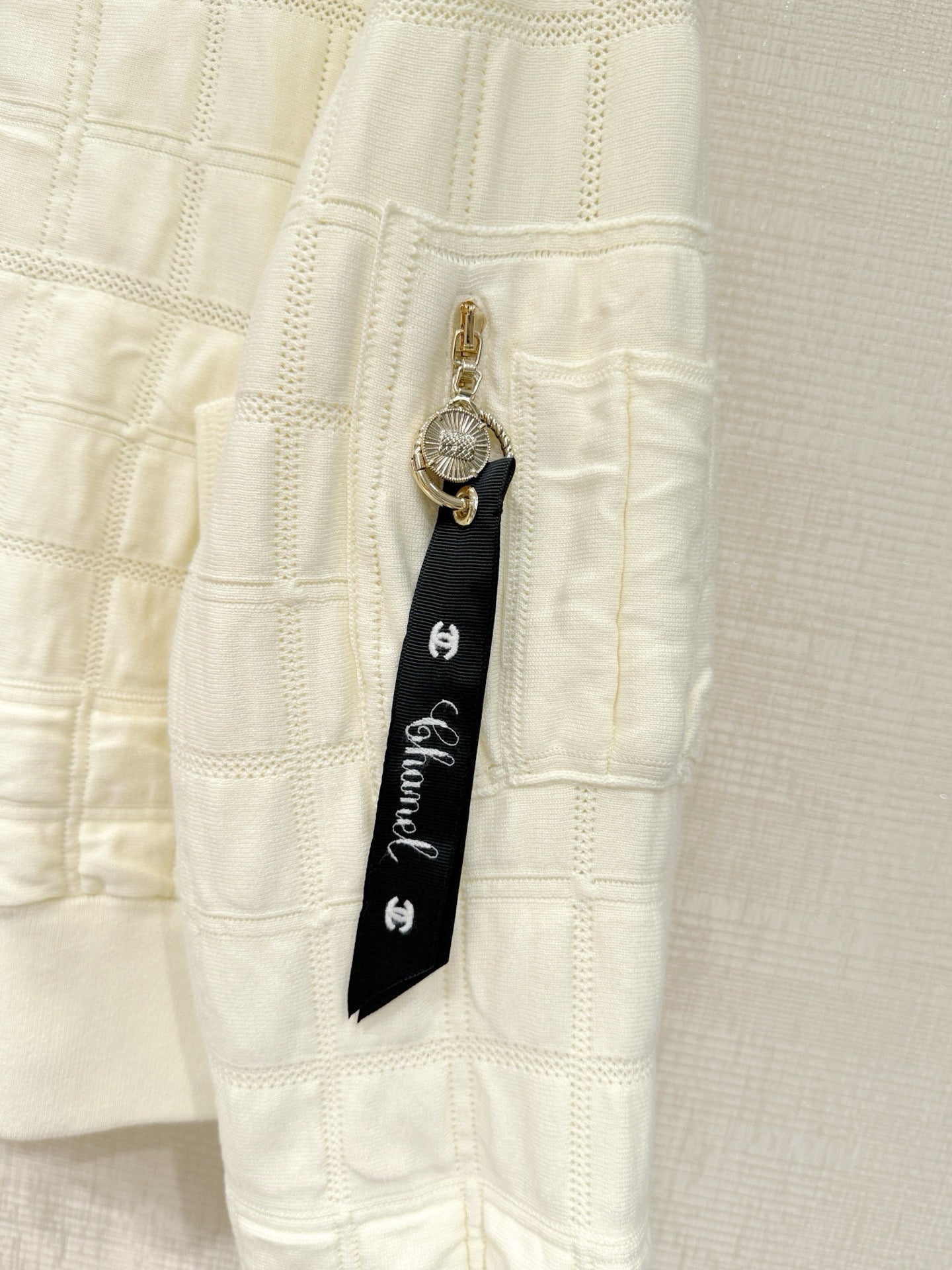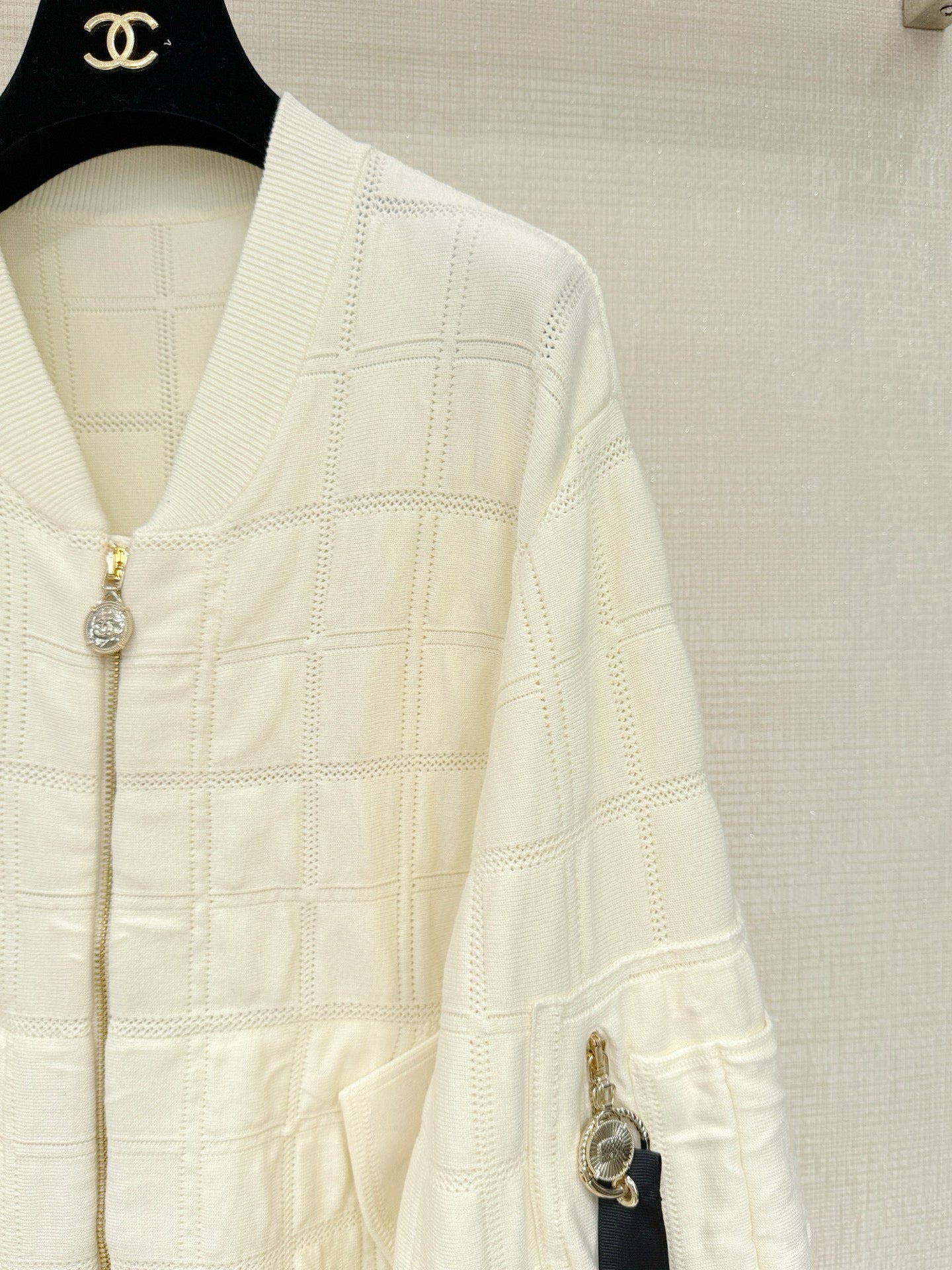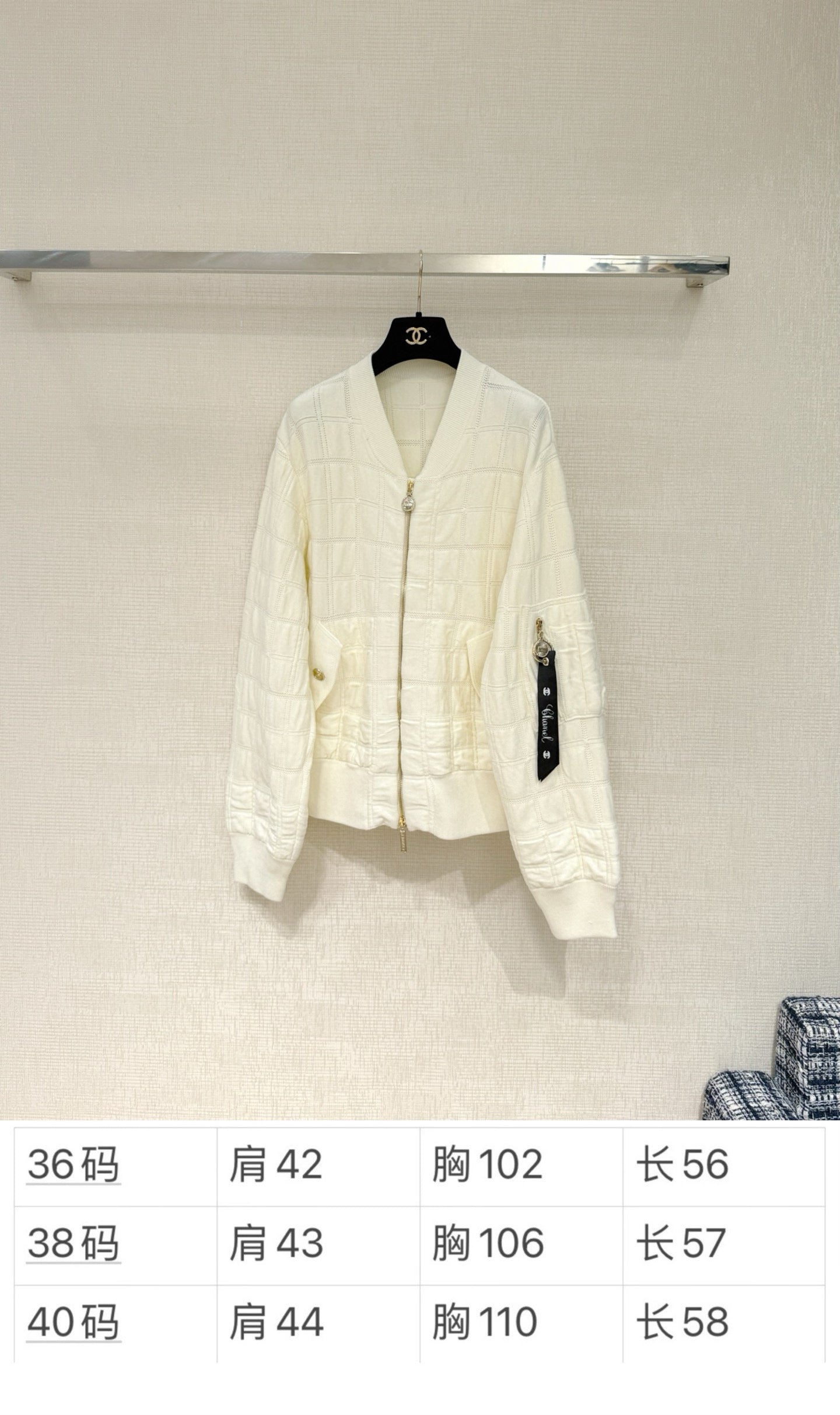 Chane* 25B Métiers d'Art collection new arrival: Stand-up collar zip-up baseball jacket with ribbon.