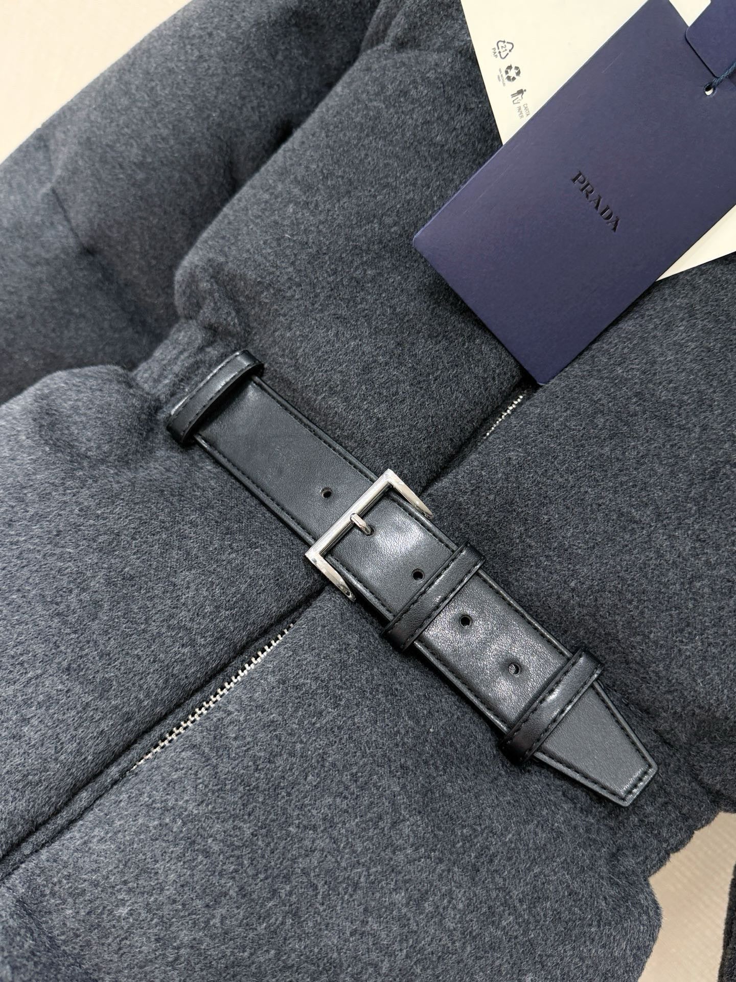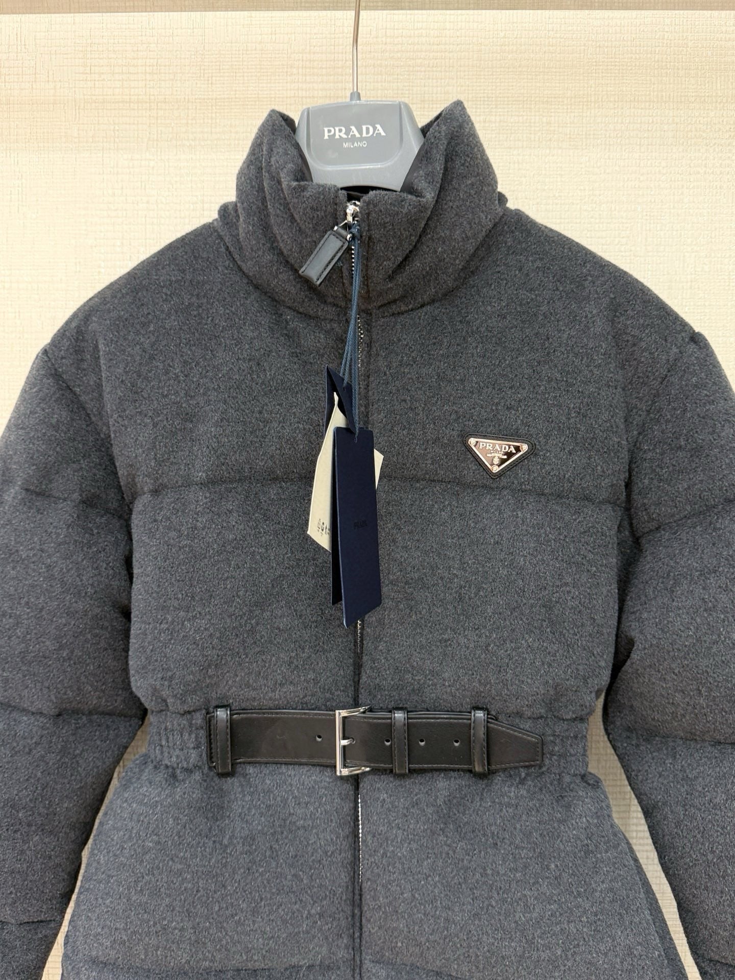 Prad* Autumn/Winter New Style Stand Collar Leather Belt Belt Wool Down Jacket